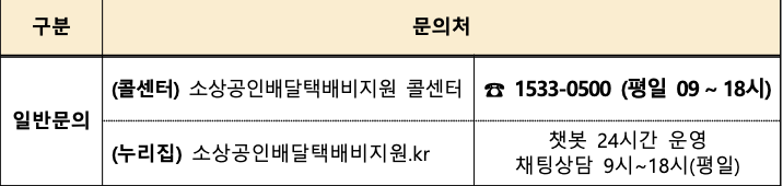 전화문의: 소상공인배달택배비지원 콜센터 1533-0500 (평일 09~18시)